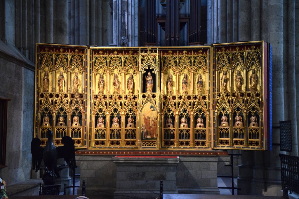 Interiornya tak kalah menakjubkan. Cahaya matahari yang menembus kaca patri berwarna menciptakan suasana sakral yang memikat. Salah satu daya tarik utama adalah Shrine of the Three Kings—relik yang dipercaya menyimpan peninggalan Tiga Raja.